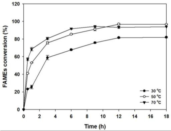 A higher temperature in transesterification has a positive effect on the reaction rate due to the exothermic characteristics [9]. In addition, the oil viscosity and the reaction time can be reduced by a high reaction temperature [25]. However, denaturation of the enzyme can occur if the temperature is increased too much, which would lead to a decrease in its activity. In general, the optimum activity of lipase is achieved between 20 and 70 °C [14]. Lipase-catalyzed reactions were carried out between 30 and 70 °C to determine the optimal reaction temperature for transformer insulating oil conversion (Figure 5). As the reaction temperature increased up to 70 °C, the initial synthesis rate of transformer insulating oil gradually increased. The transformer insulating oil synthesis quickly reached 92% (w/w), based on the soybean oil, after a reaction time of 6 h at 70 °C; the productivity of transformer insulating oil from soybean oil was 351.8 g/L/h. Although the initial rate at 50 °C was low, after 24 h the final transformer insulating oil conversion was similar to that obtained at a reaction temperature of 70 °C. The optimum reaction temperature based on the productivity was thus determined to be 70 °C.