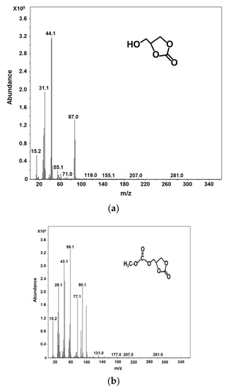 Mass spectra of (a) glycerol carbonate and (b) glycerol dicarbonate.
