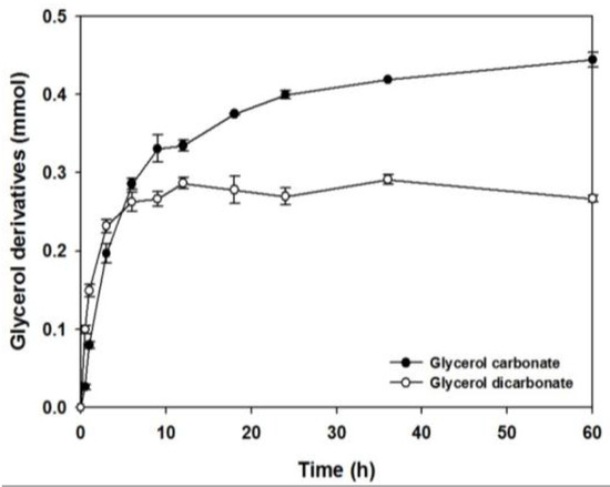 In order to confirm the structure and amount of glycerol carbonate and glycerol dicarbonate, the glycerol derivatives generated from soybean oil and DMC were analyzed by gas chromatography (GC) and GC/MS (Figure 6). Glycerol carbonate was compared with a standard substance, and glycerol dicarbonate was in good agreement with the reference data obtained from the main fragment (m/z 59 and m/z 100) [21]. The rate of glycerol dicarbonate synthesis was faster than that of glycerol carbonate synthesis in the early stage (Figure 7). This is consistent with the reaction pathway shown in Figure 1b, showing that glycerol dicarbonate is synthesized first rather than glycerol carbonate. According to the final step of reaction pathway in Figure 1b, the amount of glycerol dicarbonate would decrease due to its conversion to glycerol carbonate via hydrolysis. Interestingly, both glycerol dicarbonate and glycerol carbonate were saturated with increasing the reaction time. It important to note that the amount of water added for maintaining lipase activity was very small, around 0.11 mmol (0.5 v/v % water); thus, the amount of water was not enough to convert glycerol dicarbonate to glycerol carbonate in Figure 7. Based on these results, we suggest that both reaction pathways, as shown in Figure 1b and Figure 8, might simultaneously occur in the reaction.