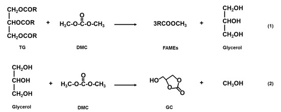 DMC is used an acyl acceptor to prevent the co-production of glycerol, and it is a versatile solvent due to its neutral, odorless, non-corrosive, and non-toxic properties [19]. During DMC-based transesterification, glycerol derivatives were produced as byproducts; these have a higher market value than glycerol. Therefore, DMC-based transesterification is a prudent way to make glycerol-free fuel production more viable [20].