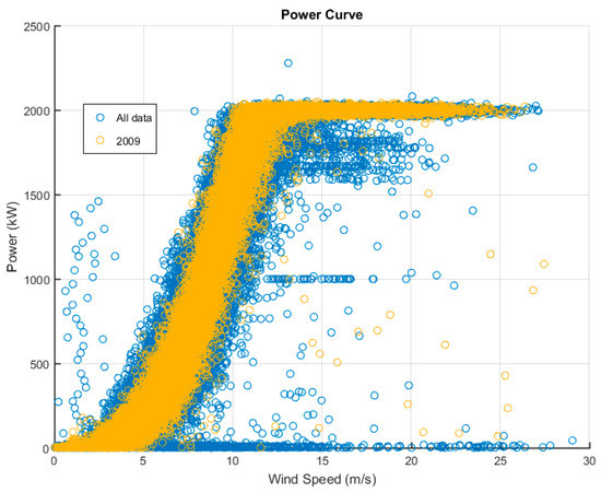 The data set was screened removing outliers, values out of range and reconstructing missing data whenever possible. Finally, the screened data corresponding to 2009 were selected as a training set for obtaining the reference patterns of behavior that will be the basis for detection of anomalies. This decision was based on the selection of all the operation conditions of the wind turbine inside a time window covering the four seasons of a year and in the inner possible real power curve observed in the wind turbine. Figure 1 presents in yellow the final training set that was selected, corresponding to the power curve of the wind turbine in 2009. Furthermore, the rest of the variables with the same timestamp of those that were presented in Figure 1 were selected. The wind speed used in the power curve corresponds to the hub height wind speed with neglected aerodynamic interaction. In theory, the power curve has to be a thin line, but, as observed in Figure 1 and Figure 2, in practice, this line is thick due to different effects that cause some deviations, such as the inertia of positioning controllers, turbulences, and others. The most important aspect is that it is necessary to assure that the width of the power curve does not increase, because if this does occur then some anomaly or degradation is taking place.