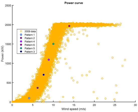 These reference patterns define the most general behavior of the wind turbine based on its power curve. The patterns are based on a self-organized map (SOM) [16] whose inputs were the wind speed and the power generated. A self-organized map is a type of artificial neural network able to be trained under unsupervised learning to produce a discretized representation of the input space of the training samples as patterns that are representing them. A self-organized map is based on competitive learning as opposed to error-correction learning methods used in supervised neural networks. This type of learning uses a neighborhood function to preserve the topological properties of the input space, defined by the training set configuring an ordered map of patterns.
