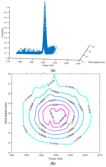 Probability distribution function for the pattern representing the highest production of electricity in the wind turbine: (a) tridimensional scatter plot; (b) probability contour plot.