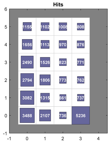 Table 3 represents the values of the 24 patterns that were discovered (five values for each one in this order: power generated by the wind turbine in kW, wind speed in m/s, temperature of the bearing at one end of the electrical generator axis in °C, the temperature of the bearing at the opposite axis end in °C and the temperature of the electrical generator slip rings in °C). These patterns are ordered by rows and columns, as shown in Figure 6, where four columns and six rows can be observed representing each squared form as a pattern and the number inside is the number of samples represented by each pattern. It is easy to observe in this figure that the upper right corner corresponds to cases observed for the maximum electricity generation. The column of neurons on the right side corresponds to generation at higher wind speeds, while the column of neurons on the left side corresponds to generation at lower wind speeds. This organization is similar to the weights that were obtained for the reference patterns in the case of the gearbox, therefore, both can be compared. Also, the typical values of temperatures observed in the electrical generator for the working conditions of the wind turbine are easily followed in the table shown in Table 3.