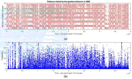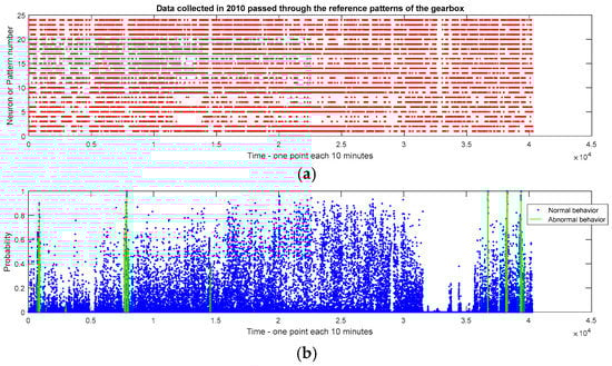 Data collected in 2010 and passed through the 24 patterns discovered characterizing the behavior of the gearbox of the wind turbine in 2009: (a) The graph presents the neuron representing the sample; (b) the graph shows the probability that the sample belongs to the associated pattern. The anomalies detected are in green indicating a probability of being an anomaly.