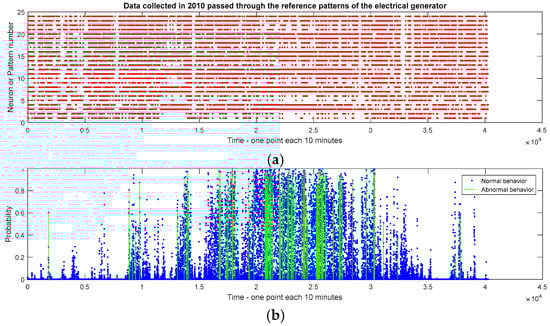 Data collected in 2010 and passed through the 24 patterns discovered characterizing the behavior of the electrical generator of the wind turbine in 2009: (a) The graph presents the neuron representing the sample; (b) the graph shows the probability that the sample belongs to the associated pattern. The anomalies detected are in green indicating a probability of being an anomaly.