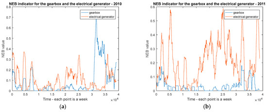 Non-expected behavior (NEB) indicators for the gearbox and the electrical generator in the years 2010 (a) and 2011 (b).
