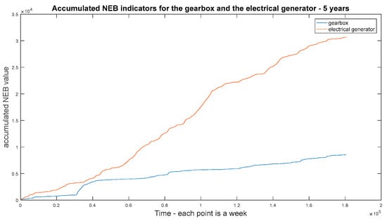 Accumulated NEB indicators for the gearbox and the electrical generator between 2010 and 2014.