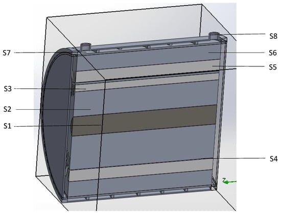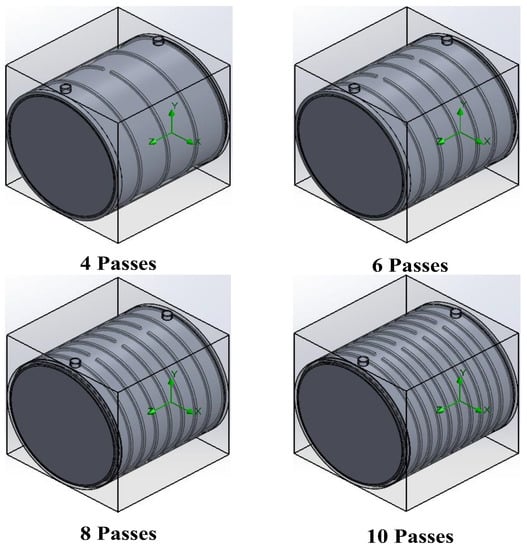 Lowering the motor’s maximum temperature below the critical value without incurring an increase in pumping power and coolant load is the main objective of the cooling jacket. For this purpose, jacket layouts are modeled with the following two parameters. One is the number of flow passes in the cooling jacket as shown in Figure 2, where the number of passes ranges from four to ten with an increment of two passes.