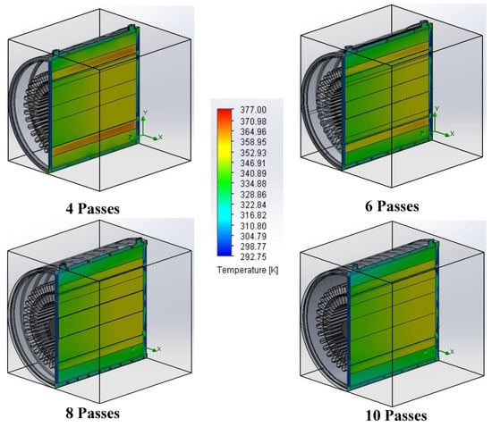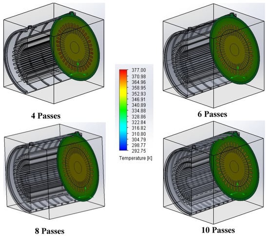 Figure 6 shows the cutaway section near the exit port at the same axial location where the maximum temperature zone occurs. For all cases of 4–10 passes the highest temperature rise occurs in stator windings which can be attributed to high heat generation from winding losses and its lower equivalent thermal conductivity. Similar results have been reported by other researchers [17,21]. The maximum temperatures in the stator winding decrease as the number of passes are increased, although the lowering of the temperature becomes less effective as the number of passes are increased beyond six passes. There is little difference between eight and ten passes.