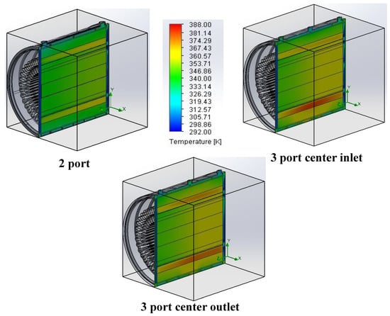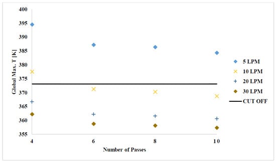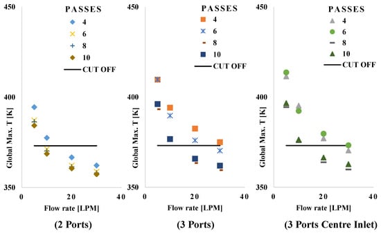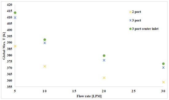 Figure 14 shows the effect of the flow rate on jacket configuration. It is evident from the figure that the two-port jacket configuration is the optimal layout for the lowest global maximum temperatures. Similar trends were observed for all numbers of passes.
