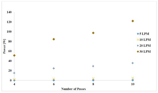The downside of increasing the number of passes is that it increases the motor pumping power as presented in Figure 8. The mean velocity of the coolant is directly proportional to the number of passes resulting in an increase in the jacket surface friction losses. At a fixed number of flow passes, increasing the flow rate results in an increase in the pressure loss. The increase in the pressure loss is partly due to the increase in the average velocity in the passage and partly from the complex secondary flows between passes as will be shown later in Figure 13. Cuiping et al. [18] studied the cooling of induction motor by varying the flow passes in axial direction from 1 to 50 and came up with an optimized flow pass number between 18 and 24 based on pressure drop and temperature of the motor. The coolant flow in this study is in the circumferential direction and based on our cut off temperature of 373 K, a minimum of 4 passes can satisfy the cut off temperature at a flowrate of about 15 LPM. At this flow rate the pumping power is in the range of 10 W, which is a reasonable value. The lowest pumping power is for 5 LPM, but as discussed earlier it does not satisfy the cut off temperature limit.