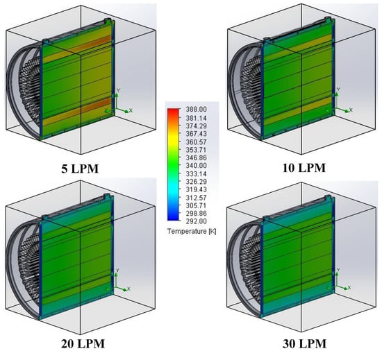 Figure 7 displays the maximum temperature inside the motor, which occurs at stator windings, as a function of the number of flow passes for one inlet and one outlet port configuration. It can be seen that increasing the number of passes results in a decrease in the maximum temperature. Apart from 5 LPM for all number of passes and 10 LPM at four passes, all other configurations satisfy the cutoff temperature of 373 K.