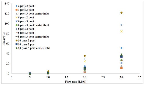 Pumping power as a function of flow rate for all configurations.