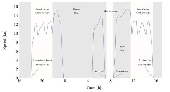 Reference operational profile (ship speed vs. time) for the case study. The two-way voyage from Stockholm to Mariehamn typically includes two stops in port, one period of stationing at sea during night, and two main sailing parts.