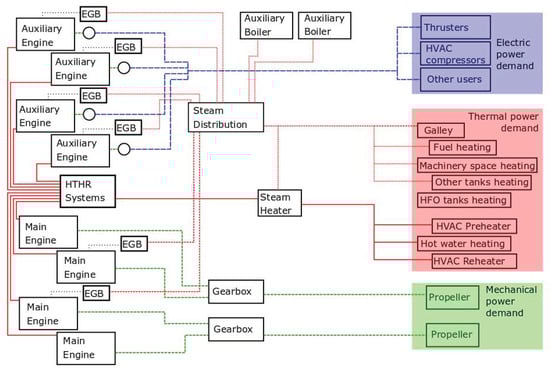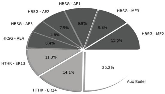 The heat demand was subdivided among the contributions of the HVAC preheater () and reheater (), the hot water heater (), the HFO heaters () the tank heating systems for HFO () and other liquids (), the machinery space heating () and other tanks (). The heat generation is instead composed of the contribution of the exhaust gas boilers ( and ), the heat recovery from the HT cooling systems () and the boilers (). The heat demand and generation are summarized in Equations (13) and (14).