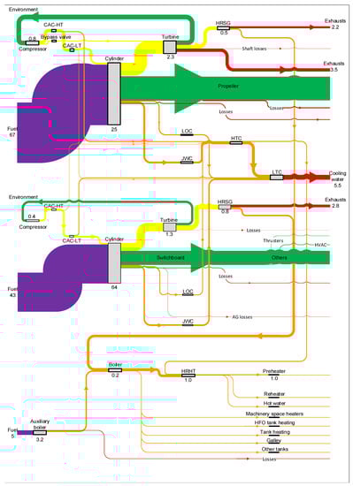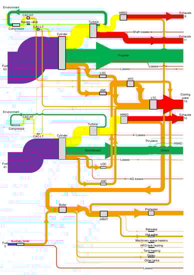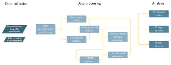 In this paper, we present the application of energy and exergy analysis (described in Section 2.2) to a cruise ship. This is done for one specific case study vessel, described in Section 2.1, including the specifics of the available information, in particular the measured data and the technical documentation; the specific assumptions and methods used for processing the available information into energy and exergy flows are summarized in Section 2.3, while a more thorough description is provided in the Appendix A.