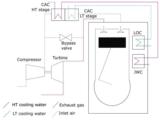 The Diesel engines are the only source of electric and mechanical power in the system, subdivided in four main engines for propulsion and four AEs for on-board electric power generation. The energy and exergy analysis of the engines is not limited to the boundary of the system, but is brought to the detail of the different components that constitute the engine systems, as shown in Figure 4.