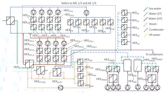 General view of the ship heating and cooling systems. The full list of heat exchangers in the heat exchanger network is provided in Appendix A.5 in Table A7.