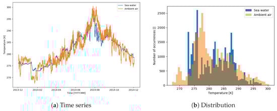 Since measurements of ambient and seawater temperature from on-board logging systems were not available for the whole dataset, we used measurements from the Swedish Meteorological and Hydrological Institute (SMHI) [31]. We used data from the lighthouse “Landsort” for the seawater, and from the lighthouse Svenska Högarna for the ambient temperature, both located along the route of the vessel.