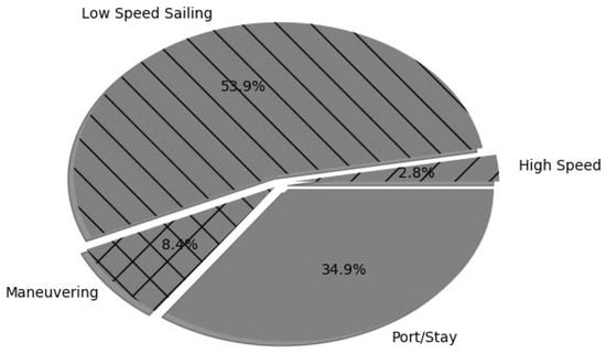 The selection of the four operational modes was performed based on standard practices in the analysis of maritime operations, and on the specifics of the case study. The distinction between “Sailing”, “Maneuvering” and “Port stay” is typical for describing ship’s operations, and was hence taken as a starting point. Based on an exploratory analysis of the data, we could notice that the ship regularly stop at sea during night hours: this type of operation was merged with the “Port stays” operations, as they are equivalent from an energy analysis perspective. Finally, the low-speed and high-speed operational modes were separated, as the first refers to operational conditions according to a standard schedule, while the second refers to special operational conditions that occurred only a few times during the operational period analyzed in this study.