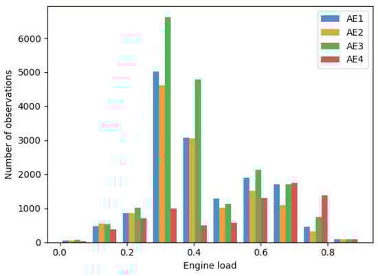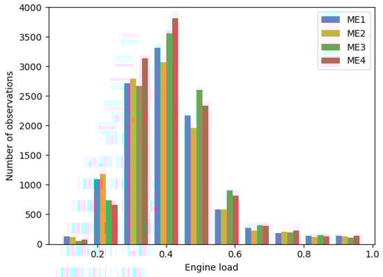 The power output of the main engines was not measured and needed to be estimated. In this work, we calculated the engine power output based on measurements of engine fuel rack position (used as a proxy of the mass of fuel injected per cycle) and of the engine speed (see Equations (9)–()). In the case of the AEs, instead, direct measurements of the power generated by each engine were available.