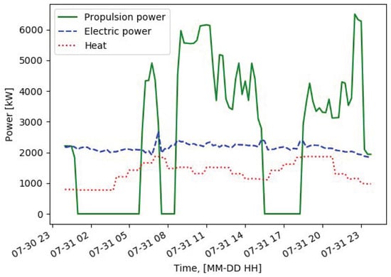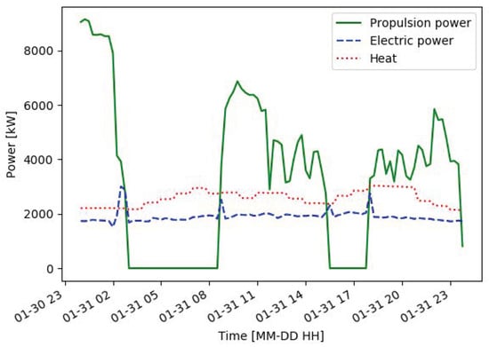 The ship has a capacity of 1800 passengers and has several restaurants, night clubs and bars, as well as saunas and pools. This means that the heat and electricity demands are expected to be higher compared to a cargo vessel of the same size. Typical ship’s operations, although they can vary slightly between different days, are represented in Figure 1. It should be noted that the ship stops and drifts in open sea during night hours before mooring at its destination in the morning, if allowed by weather conditions.