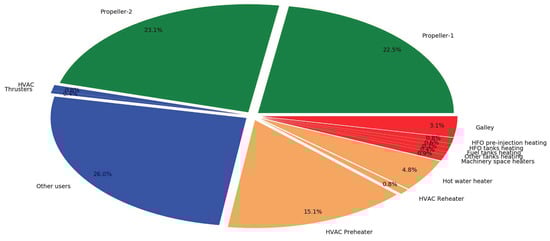The ship is equipped with a number of different systems, including lighting, navigational systems, pumps and compressors, etc. However, none of the individual contributions is directly measured. Hence, estimations of the energy demand of individual consumers needed to be based on indirect measurements. In this paper only the contributions of the HVAC and the bow thrusters were identified separately from the remaining parts of the system. More details about how these contributions were separated are provided in Appendix A.3.