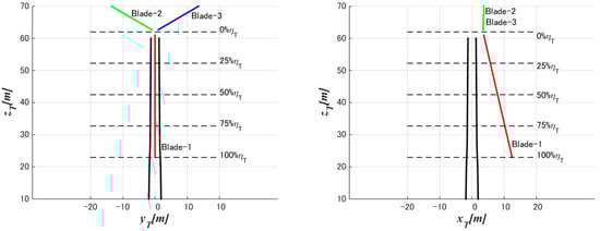 The prototype of the SUBARU 80/2.0 downwind turbine (Figure 3) [,], which is the first MW-class commercial downwind turbine, is used in this study. Its general specifications are shown in Table 1. The schematics of the rear view (−xT) and the side view (+yT) are calculated as shown in Figure 4, assuming a rigid structure. The rotor rotates counterclockwise in the rear view. The five lines in these figures show the tower stations ηT in front of the blade station radius r normalized by the rotor radius R at 180 degrees from the rotor azimuth angle. A large clearance is maintained by the tilt and coning of the rotor.