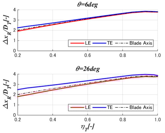 The distributions of the blade chord length c, the tower diameter DT, and their ratio are shown in Figure 5. Bladed (DNV GL Bladed, version 4.7; DNV GL: Bristol, UK, 2016.) is used for the BEM, and the model is assumed to be stiff. The normalized clearance between the tower and the rotor ΔxR/DT at 6 degrees (rated) and 26 degrees (cut-out) of blade pitch angles are shown in Figure 6.