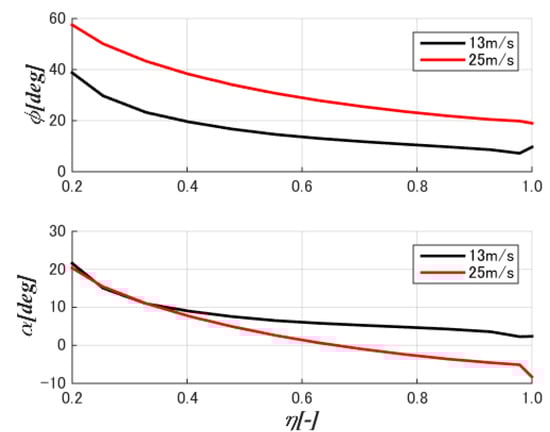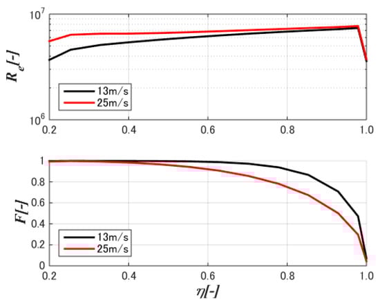 The distribution of the Reynolds number Re along the blade, which is in the order of 5–7 × 106, is shown in the top subplot of Figure 7. The tip/root loss function F, which is assumed by Pradtl’s function, is shown at the bottom of the figure.