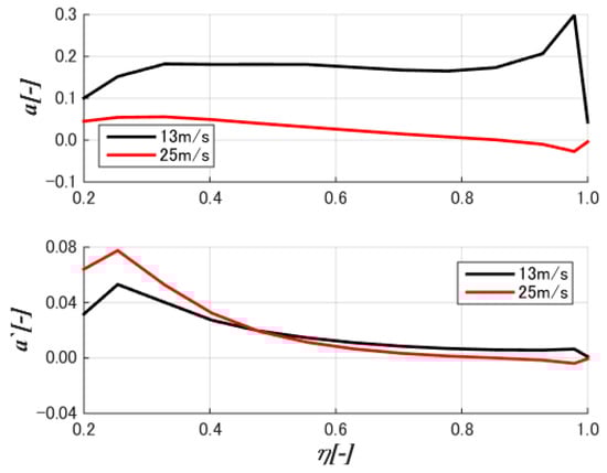 The axial induction factor a is shown in the top subplot in Figure 8 and is almost constant, approximately 0.17–0.19 between 30% and 85% of the blade station radius at 13 m/s. It is smaller than 0.05 and takes on negative values locally on the outboard sections at 25 m/s. The distribution of the tangential induction factor a′ is shown in the bottom subplot of the figure. Although, the total torque is identical to 13 m/s, the inboard sections share larger parts at 25 m/s.