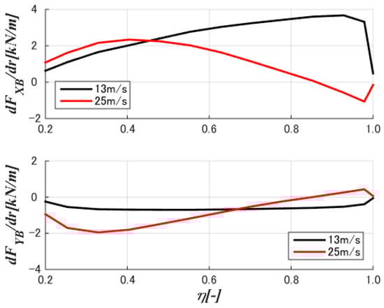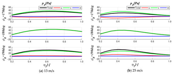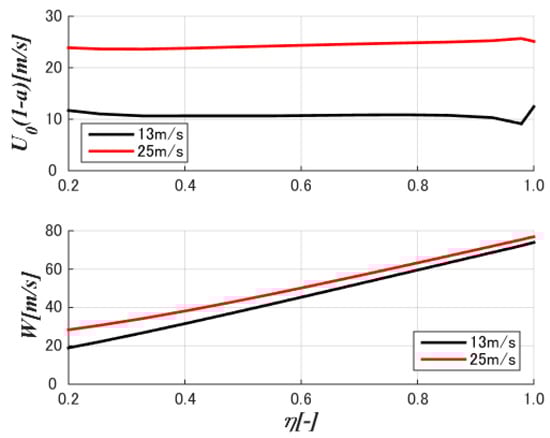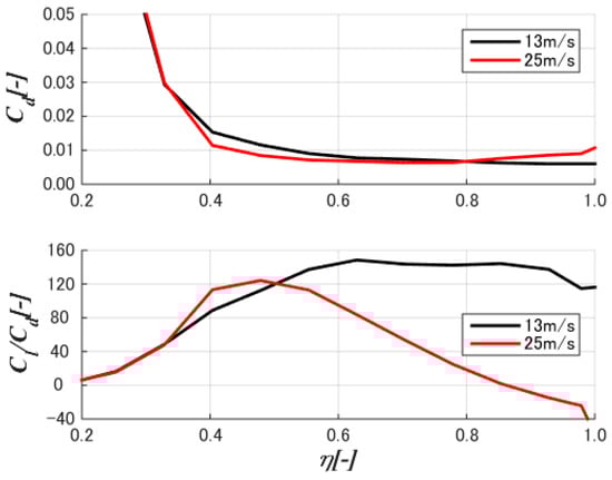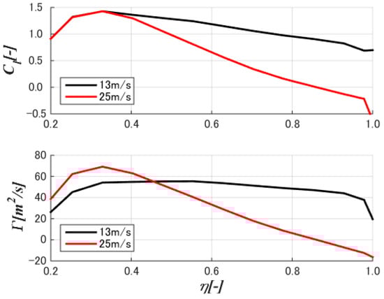 The distributions of the circulations are shown in the bottom subplot of Figure 11. Although the distribution is almost uniform at 13 m/s, it is quite smaller in the outboard section at 25 m/s.