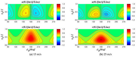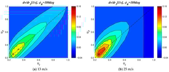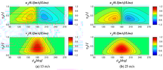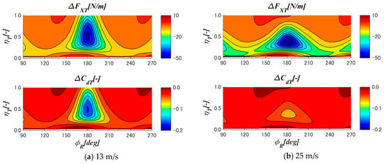 Figure 16 shows the induced lateral velocities at the tower section at ηT by blade 1 at the normalized station radius η1 for 13 m/s and 25 m/s. Blade 1 is located just behind the tower, 180 degrees of azimuth angle. The diagonal line indicates they are at the same height. These figures show that the lateral velocities are most strongly induced by the blade section around the same height, although they are slightly shifted to the inner board.