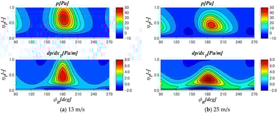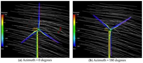 The pressures at the locations of the tower center are calculated by Bernoulli’s law. Relative wind speeds at the blade section (180 degrees of azimuth angle), tower section, and free stream are shown in Figure 2. The pressures with and without the blade circulation effects, pT1 and pT0, respectively, are described in Equations (13) and (14).