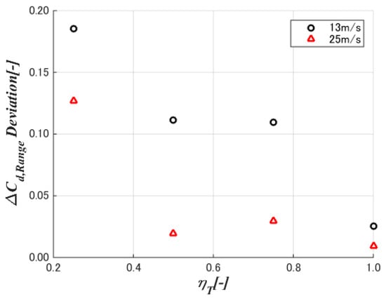 Deviation in the range of the drag coefficient ΔCd,Range as a function of the blade station radius ΔxR/DT.