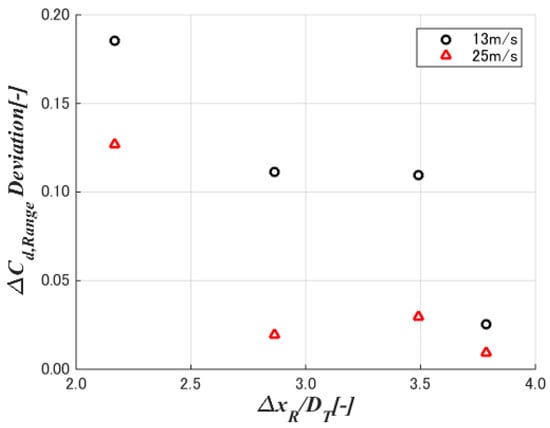Deviation in the range of the drag coefficient ΔCd,Range as a function of the rotor-tower clearance ΔxR/DT.