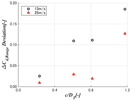 Deviation in the range of the drag coefficient ΔCd,Range as a function of the chord length c/DT.