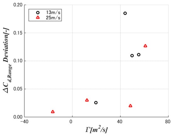 Deviation in the range of the drag coefficient ΔCd,Range as a function of the circulation Γ.