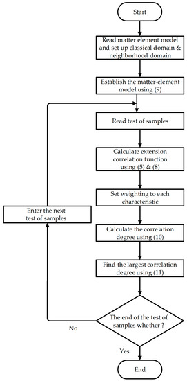 - Establish the test matter elements and a matter-element model by using the characteristic values of these test matter elements, as expressed in Equation (9).