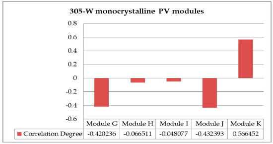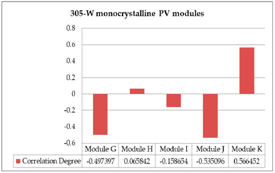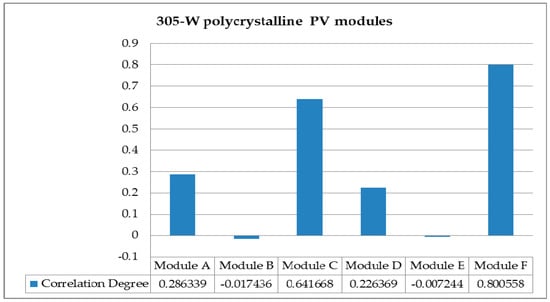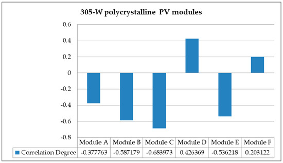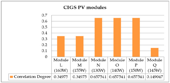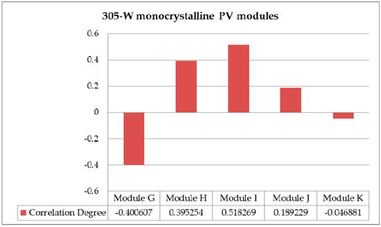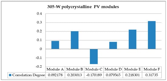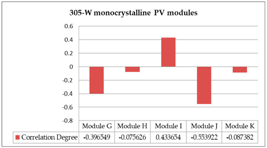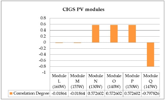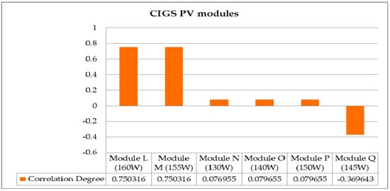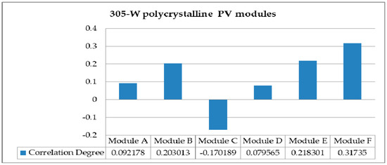 When the order of importance users placed on the four factors were, in sequence, power temperature, price, size, and weight, the characteristic weighting values for these factors were set at 0.5, 0.25, 0.15, and 0.1, respectively. The selection test results for similar PV modules listed in Table 2 are separately shown in Figure 6, Figure 7 and Figure 8; these selection results were derived using the extension method. The performance levels of the modules were evaluated using the extension method, and results indicated that the modules with increased correlation degrees were the more favorable candidates for selection. As shown in Figure 6, when power temperature was the primary factor of consideration for the 305-W polycrystalline PV modules listed in Table 2, Module D was the most favorable candidate for selection because it demonstrated the highest degree of correlation (0.426369) among the modules. By contrast, Module C was the least favorable candidate because it had the lowest degree of correlation (−0.683973) among the modules. These selection results were not consistent with those obtained when price was the primary factor of consideration. As shown in Figure 8, the CIGS Modules N, O, or P were the most favorable candidates for selection when power temperature was the primary factor of consideration, and these results were consistent with those obtained when price was the primary factor of consideration. This was primarily because power temperature imposed a limited effect on the power output of the CIGS modules.