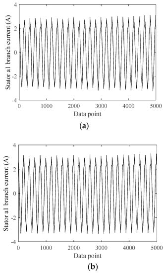 Stator a1 branch current of the experimental generator: (a) normal waveform; and (b) fault waveform.