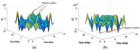 It is worth noting that the absolute mean of second-order kernel value cannot reflect inter-turn short circuit fault. This is because the absolute mean value is calculated from two-dimensional data. The second-order kernel needs to diagnose faults from 3D surfaces. The second-order kernel function surface of second group is shown in Figure 13. In Figure 13a, there are more positive peaks on the surface, while there are more negative spikes in Figure 13b. The variation rule of the second-order kernel is consistent with the conclusion in Section 5.1.