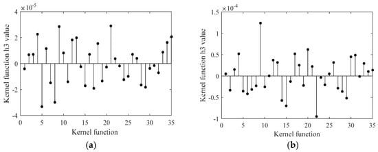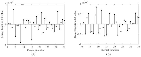Take the third-order kernel function as an example to calculate absolute mean of Volterra kernel. Figure 11 shows third-order kernel function of the first group after discretization. Figure 11a is discretization result of three-order kernel of the first group when the winding is normal. Figure 11b presents the discretization result of three-order kernel of the first group when the winding is short-circuited. The third-order kernel function of the first group after discretization is shown in Figure 12. Figure 12a is the discretization result of three-order kernel of the second group when the winding is normal. Figure 12b presents the discretization result of three-order kernel of the second group when the winding is short-circuited. Substitute the data in Figure 11 and Figure 12 into Equation (18) to calculate absolute mean of third-order Volterra kernel. Similarly, the absolute mean of first- and second-order kernels can be calculated. The calculation results are listed in Table 2 and Table 3.