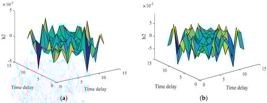 Figure 6 shows the results of the second-order kernel identification. Figure 6a is the second-order kernel identification result when the winding is normal. Figure 6b is the second-order kernel identification result when the winding is short-circuited. The second-order kernel waveform vibrates violently, and the range of vibration amplitude before and after fault is small. It is difficult to identify the inter-turn short circuit fault directly by analyzing the second-order Volterra kernel directly. Considering the characteristics of the second-order Volterra kernel, its three-dimensional surface is shown in Figure 7. Figure 7a shows the second-order kernel surface when the winding is normal. Figure 7b shows the second-order kernel surface when the winding is short-circuited. It can be seen that there are more positive peaks in the surface under normal condition of rotor winding. When inter-turn short circuit fault occurs, there are more negative peaks in the surface. It is possible to diagnosis the inter-turn short circuit based on this difference.