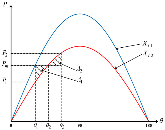 Assume that the reactance of the transmission line abruptly changes from to , which is less than . The mechanical power produced by the generator () is considered to be fixed, while the electrical active power produced by the generator will change into due to the new transmission reactance value as shown in Figure 2. The difference between mechanical and electrical active power can be calculated in the swing equation as follows: