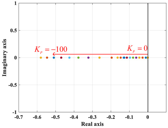 Next, the P will be determined by using (16) and (17). Then, by determining the eigenvalues of P, the stability of the system can be evaluated. Considering system parameters introduced in Table 1, by choosing Ki = 600 and KP increasing from zero to infinity, eigenvalues of P is illustrated in Figure 6. As KP increases from zero to 133, the value of one of the eigenvalues of the P increases. After that, by increasing KP from 134, one of the eigenvalues gets a large negative number. The absolute value of one of the eigenvalues decreases by increasing KP from 134 to infinity, and it gets closer to the imaginary axis. Considering the eigenvalues of P, it can be concluded the value of KP can be increased until 133 in order to work in the stable mode. In addition, if the value of KP is negative, two out of three eigenvalues of P, as shown in Figure 7, become negative.