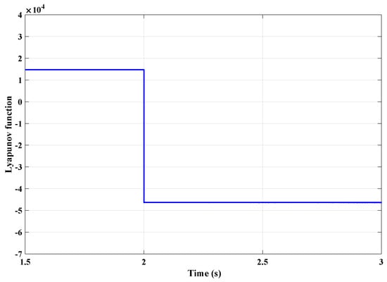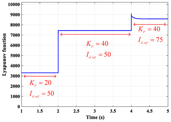 Considering the time-domain simulation of the energy function, simulated by Matlab/Simulink tool, if it is positive and its derivative with respect to the time is negative, it cannot be concluded that the system is stable. The reason is that even if P is not positive definite, the energy function may have a positive value. On the other hand, if the energy function is negative, then the system is unstable. The reason is that if the energy function is negative, then P is not positive definite, and it has at least one eigenvalue with a negative real part. These are shown in Figure 8, Figure 9 and Figure 10. In Figure 8, the system works in its stable mode with KP = 20 and Ki = 600. At t = 2 s, the value of the KP changes into 40. The energy function is still positive. Considering the P’s eigenvalues shown in Figure 6, the system will maintain stable for all state conditions. With a step change in the reference current at t = 4 s, the energy function will stay positive. Meanwhile, the current response to the step change in the reference for the mentioned condition is illustrated in Figure 9. Figure 10 shows the energy function value of the system with Id.ref = 50 A and change in KP from 70 to 140 at t = 2 s. The energy function value becomes negative at t = 2 s, which means that the system works in its unstable mode.