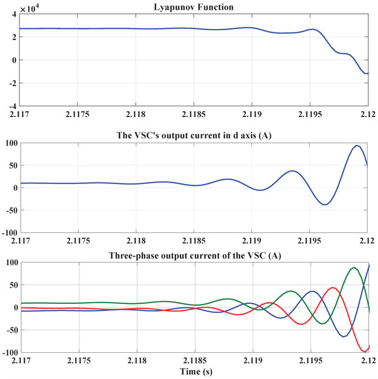 The simulation results of the current control response also show the instability in tracking the reference current after changes the KP from 80 to 160, as shown in Figure 11. The instability will not happen exactly at t = 2 s, which is due to the nonlinear behavior of the system and the time delay caused by the PWM and sampling period. Although the instability in the output current of the VSC, as shown in Figure 11, leads to a negative value for the Lyapunov function at t = 2.1198 s. In order to focus more on the behavior of the Lyapunov function, only the energy function and the output current of the VSC for the period from t = 2.117 s to 2.12 s is shown in Figure 11. This behavior of the system can be predicted by monitoring the eigenvalues of P.