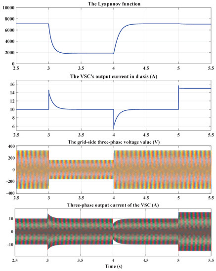 The Lyapunov function and the VSC’s output current in d-axis and in the three-phases for a step change in KP value from 80 to 160 at t = 2 s.